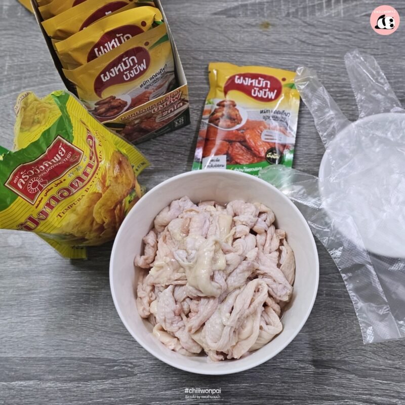2. ใส่ผงหมักบังบีฟ (ปรับเพิ่ม-ลดได้ตามชอบ) และแป้งทอดกรอบ