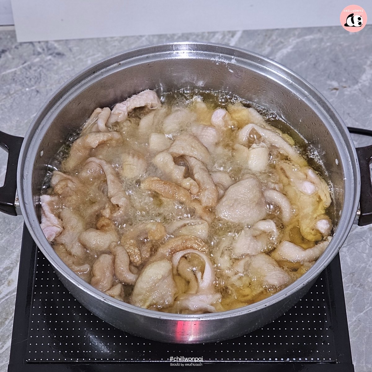 5. ทอดในน้ำมัน ใช้ไฟแรงช่วงแรก และเปลี่ยนเป็นไฟกลางจนสุกเหลือง